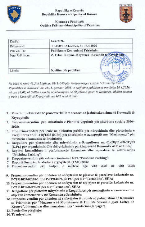 Njoftim për publikun – Mbledhja e tretë e Kuvendit të Kryeqytetit