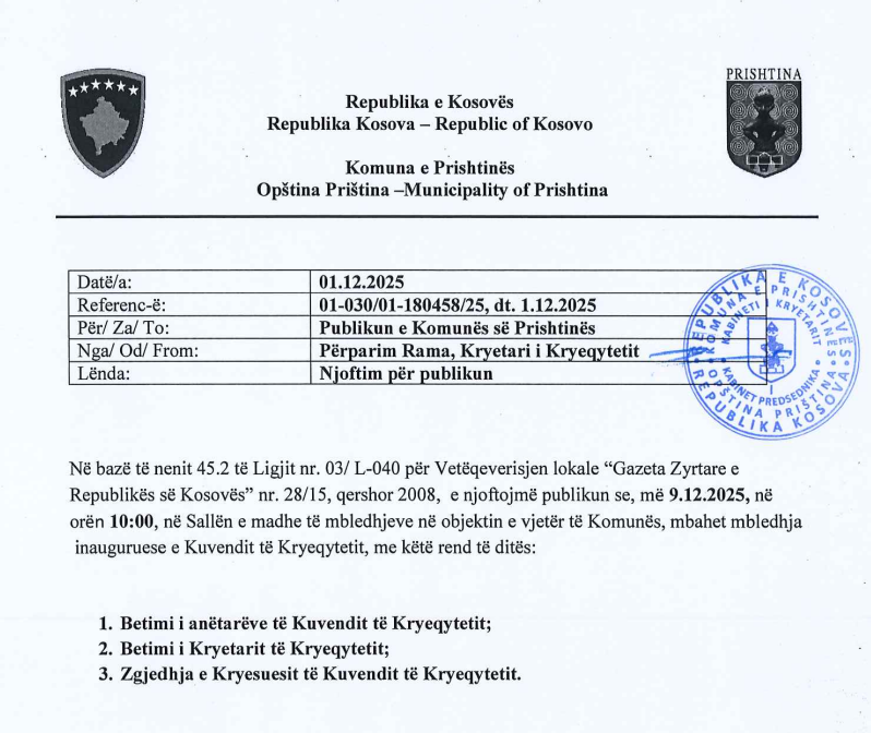 Njoftim për publikun – Mbledhja inaguruese e Kuvendit të Komunës së Prishtinës