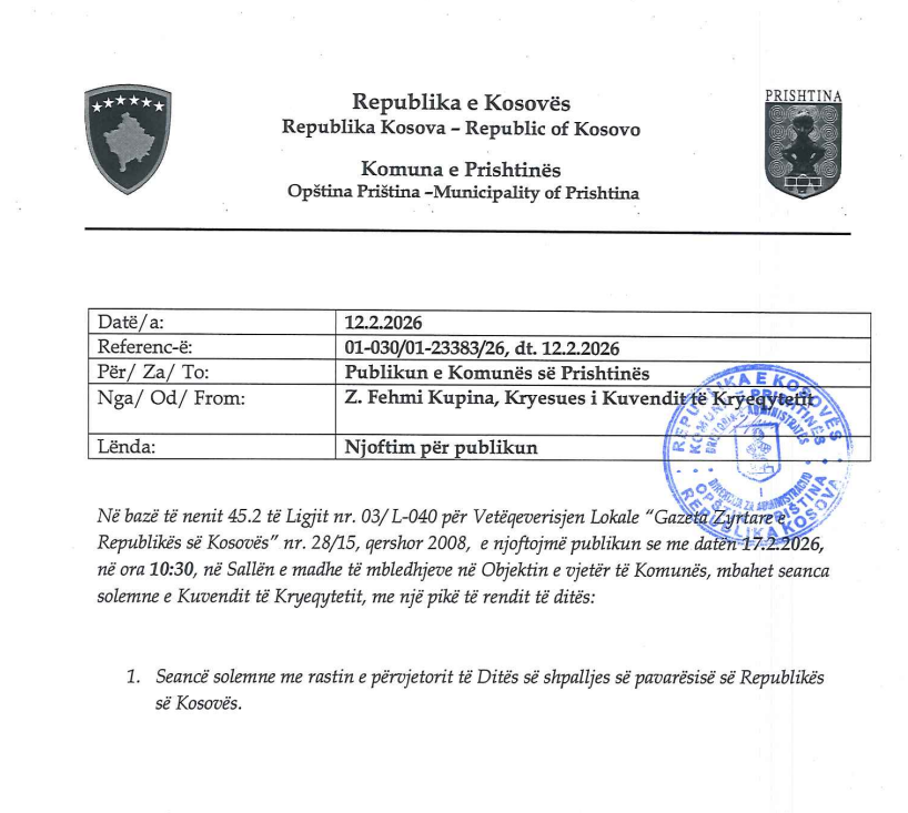 Njoftim për publikun – Seancë solemne me rastin e përvjetorit të Ditës së shpalljes së pavarësisë së Republikës së Kosovës
