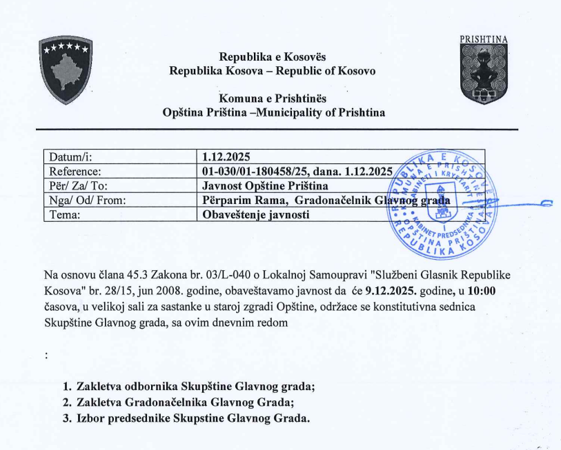 Obaveštenje za javnost – Konstitutivna sednica Skupštine Opštine Priština