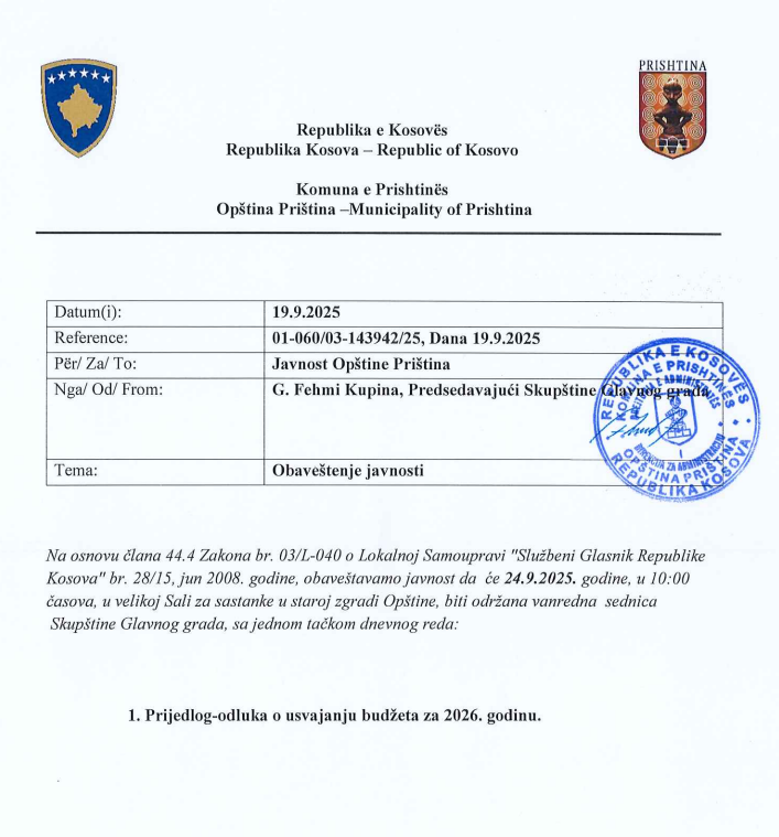Obavestenje za javnost – Vanredna sednica Skupstine Glavnog grada