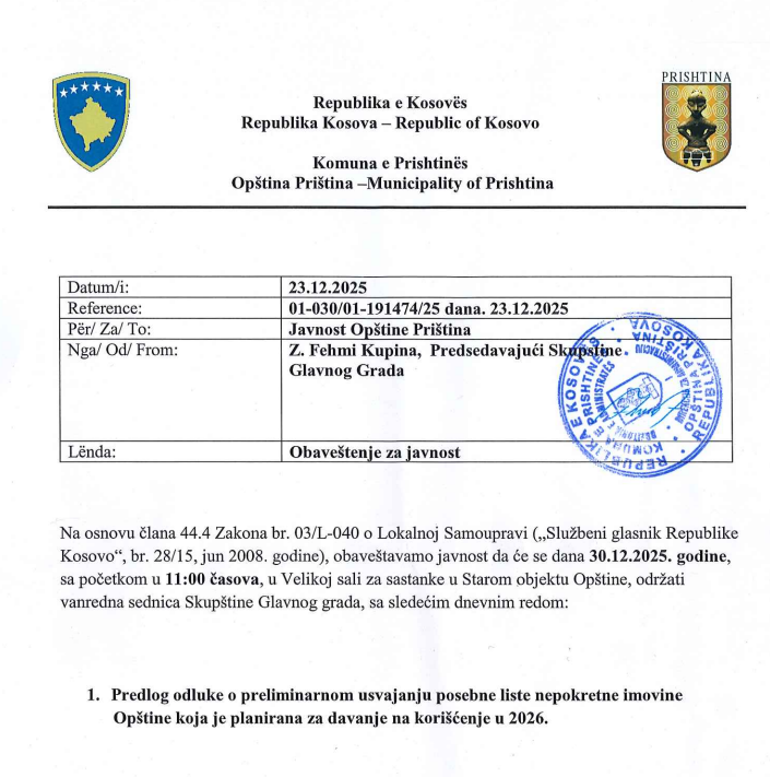 Obavestenje za javnost – Vanredna sednica Skupstine Glavnog grada