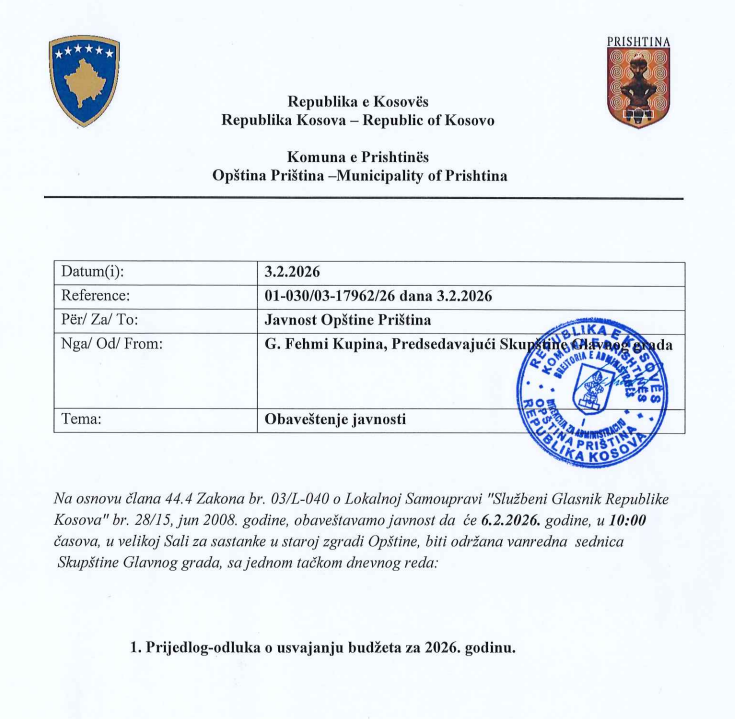 Obavestenje za javnost – Vanredna sednica Skupstine Glavnog grada