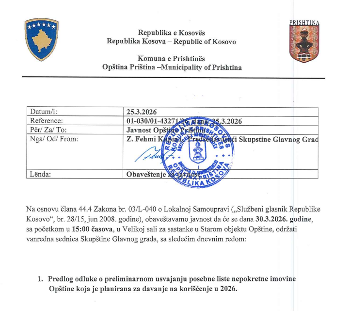 Obavestenje za javnost – Vanredna sednica Skupstine Glavnog grada